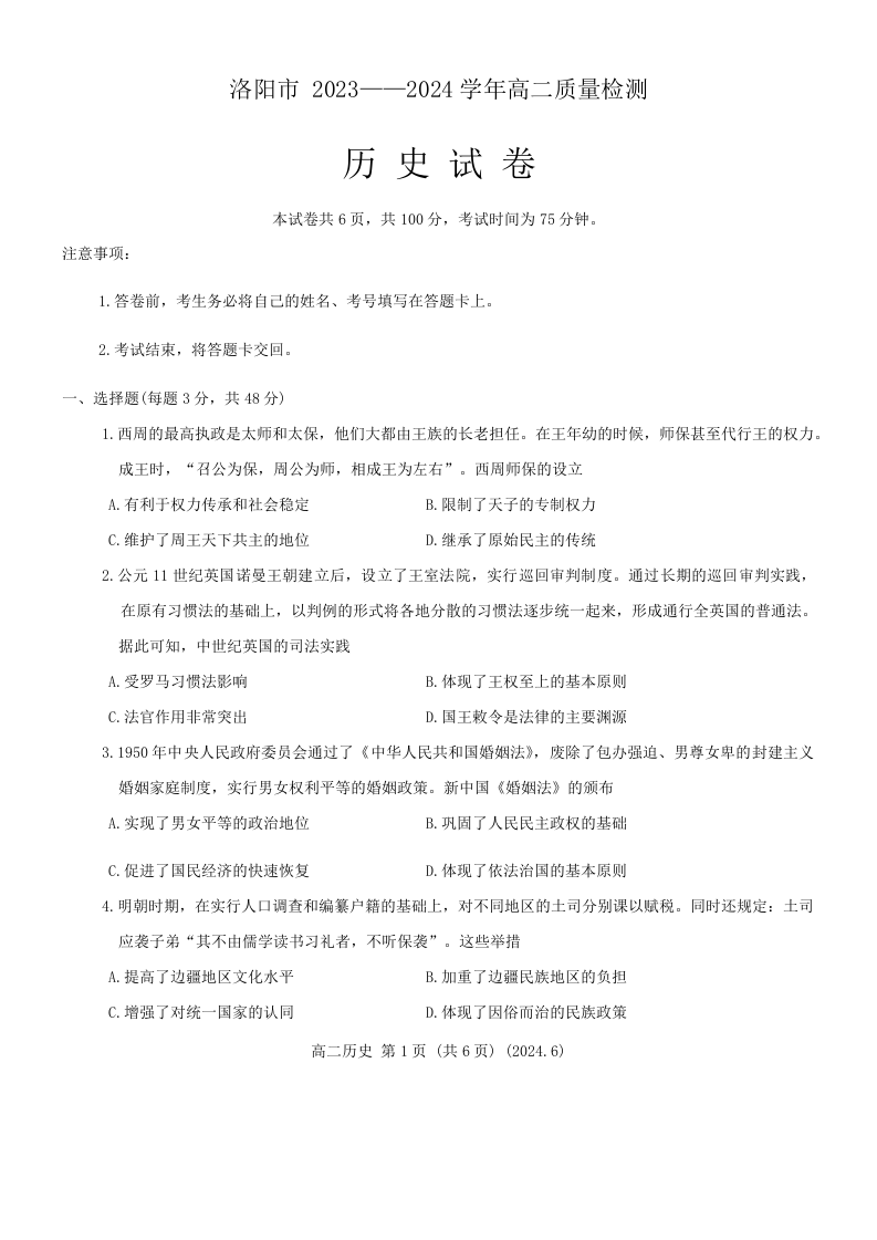 河南省洛阳市2023-2024学年高二下期期末考试历史