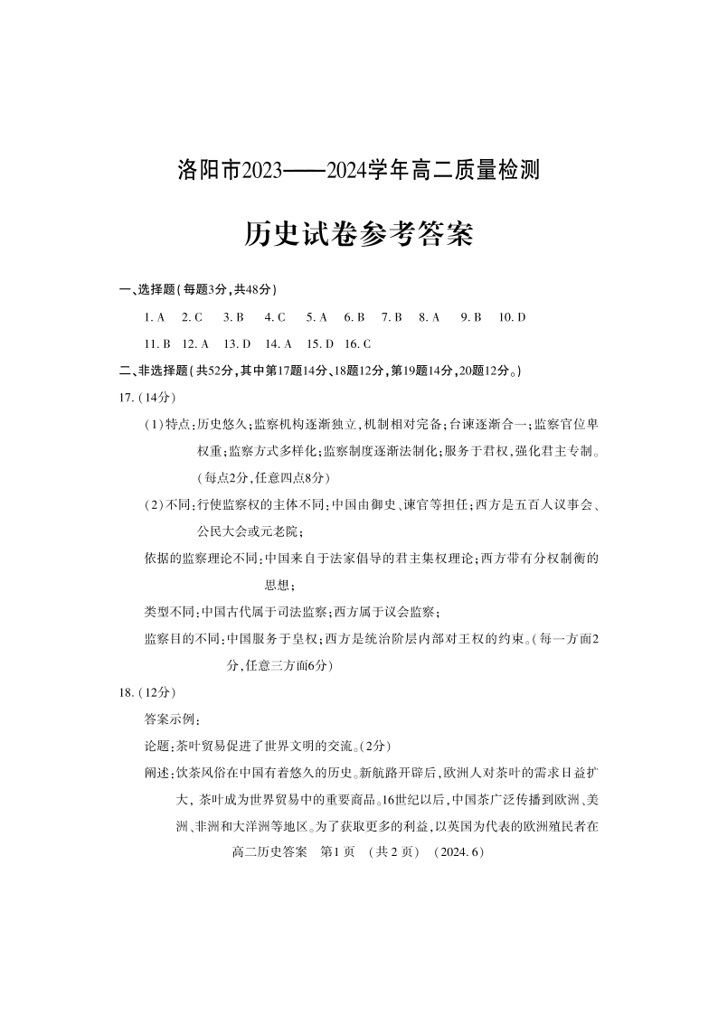 河南省洛阳市2023-2024学年高二下期期末考试历史答案