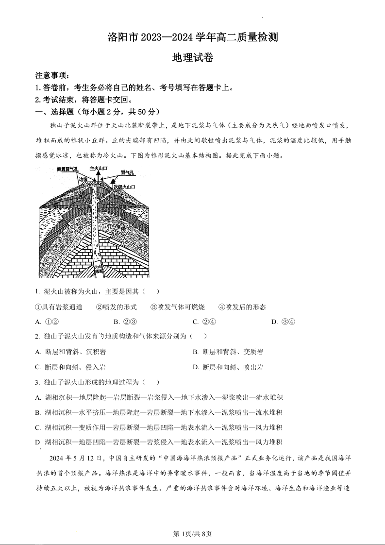 河南省洛阳市2023-2024学年高二下期期末考试地理(原卷版)