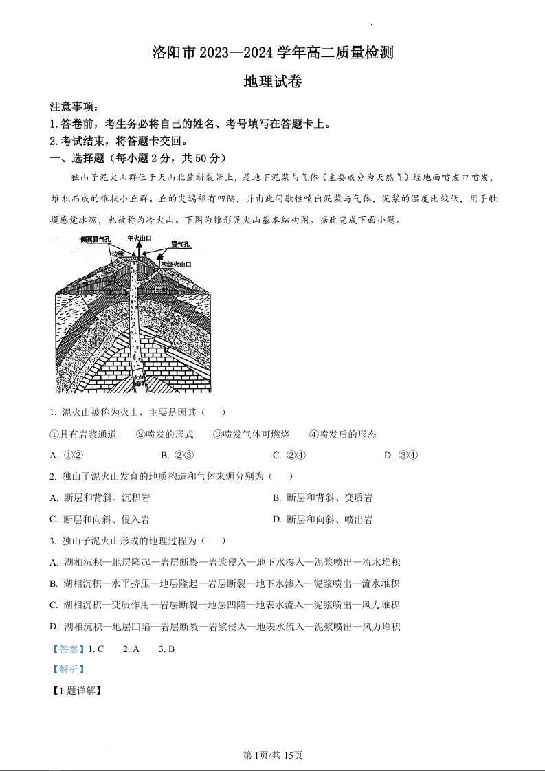 河南省洛阳市2023-2024学年高二下期期末考试地理(精品解析版)