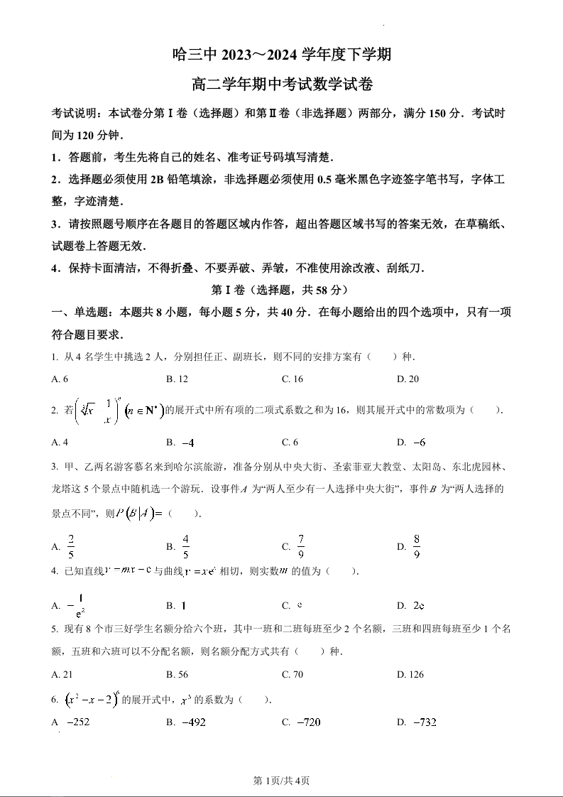 黑龙江省哈尔滨市第三中学校2023-2024学年高二下学期期中考试数学(原卷版)