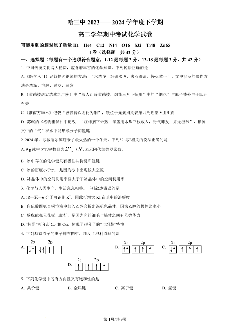 黑龙江省哈尔滨市第三中学校2023-2024学年高二下学期期中考试化学(原卷版)