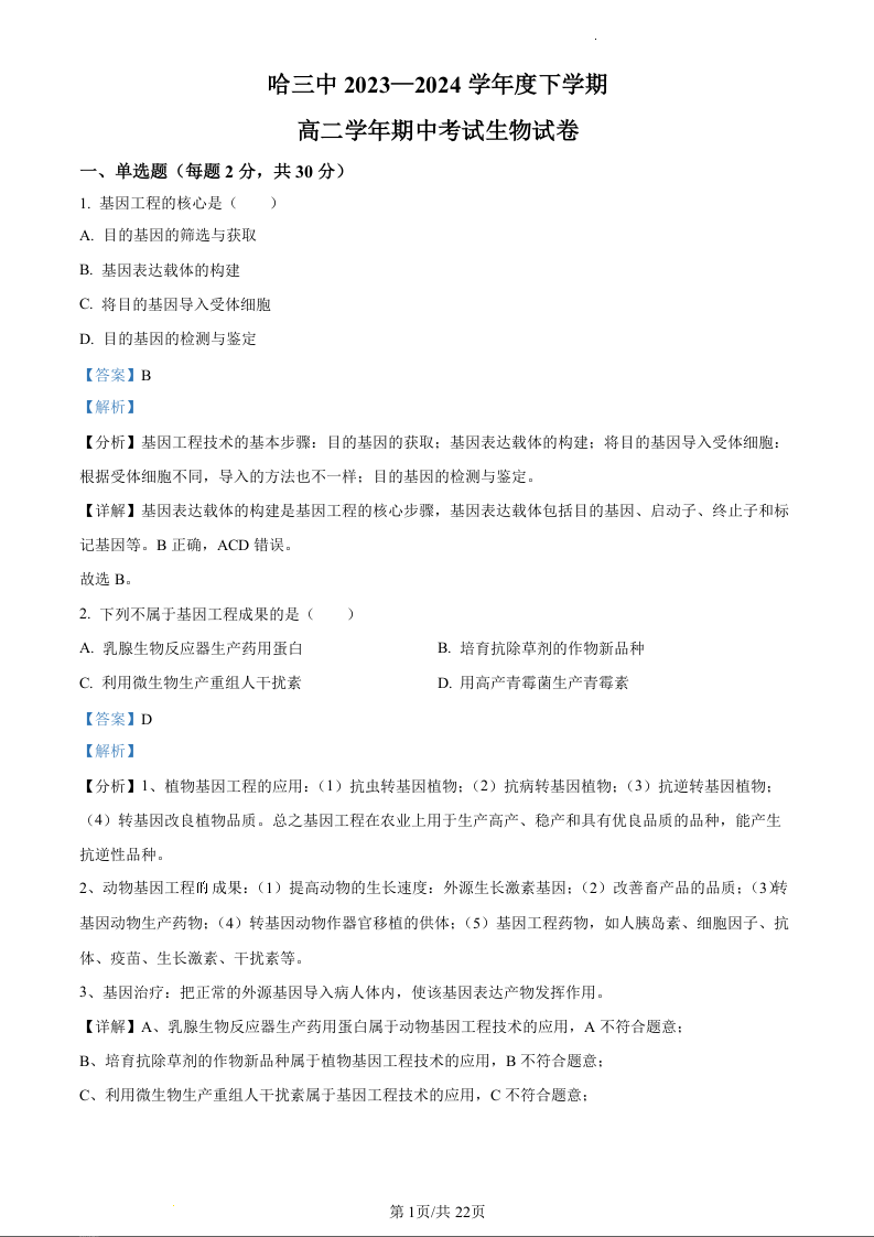 黑龙江省哈尔滨市第三中学校2023-2024学年高二下学期期中考试生物(精品解析版)