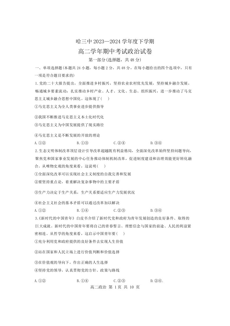 黑龙江省哈尔滨市第三中学校2023-2024学年高二下学期期中考试政治