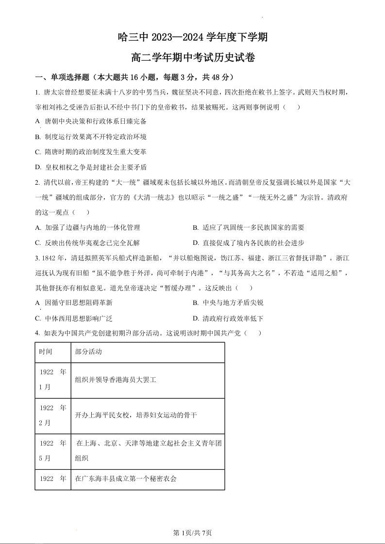 黑龙江省哈尔滨市第三中学校2023-2024学年高二下学期期中考试历史(原卷版)