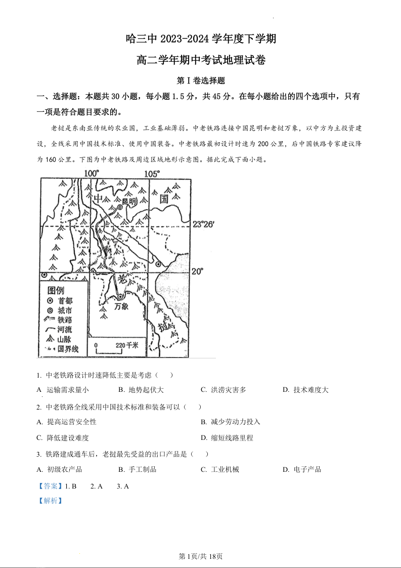 黑龙江省哈尔滨市第三中学校2023-2024学年高二下学期期中考试地理(精品解析版)