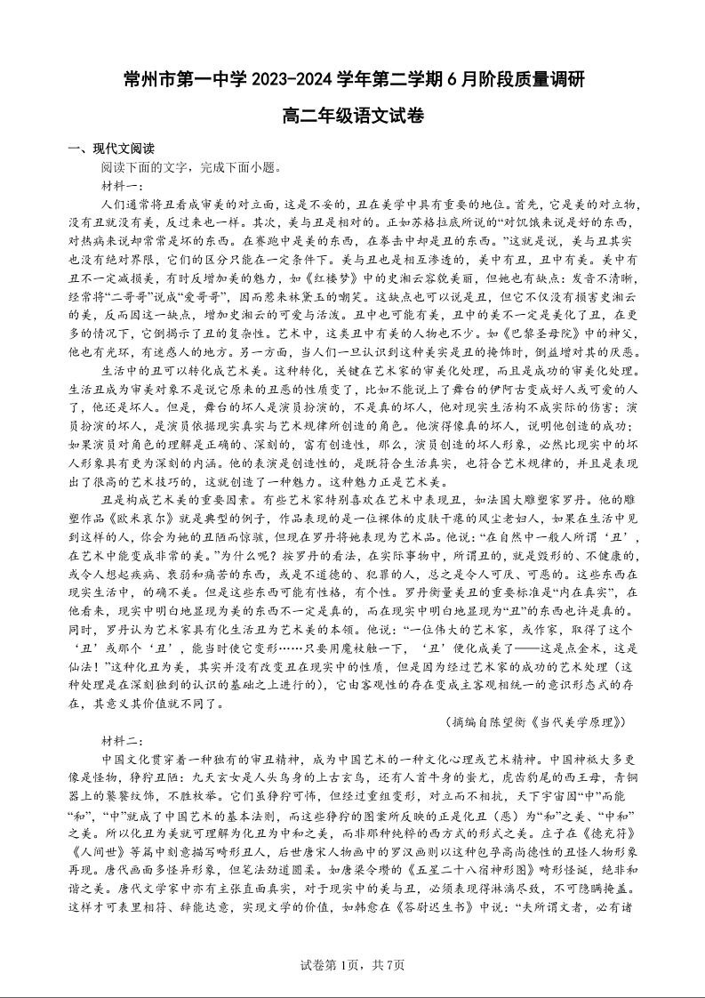 江苏省常州市第一中学2023-2024学年高二下学期6月月考语文+答案