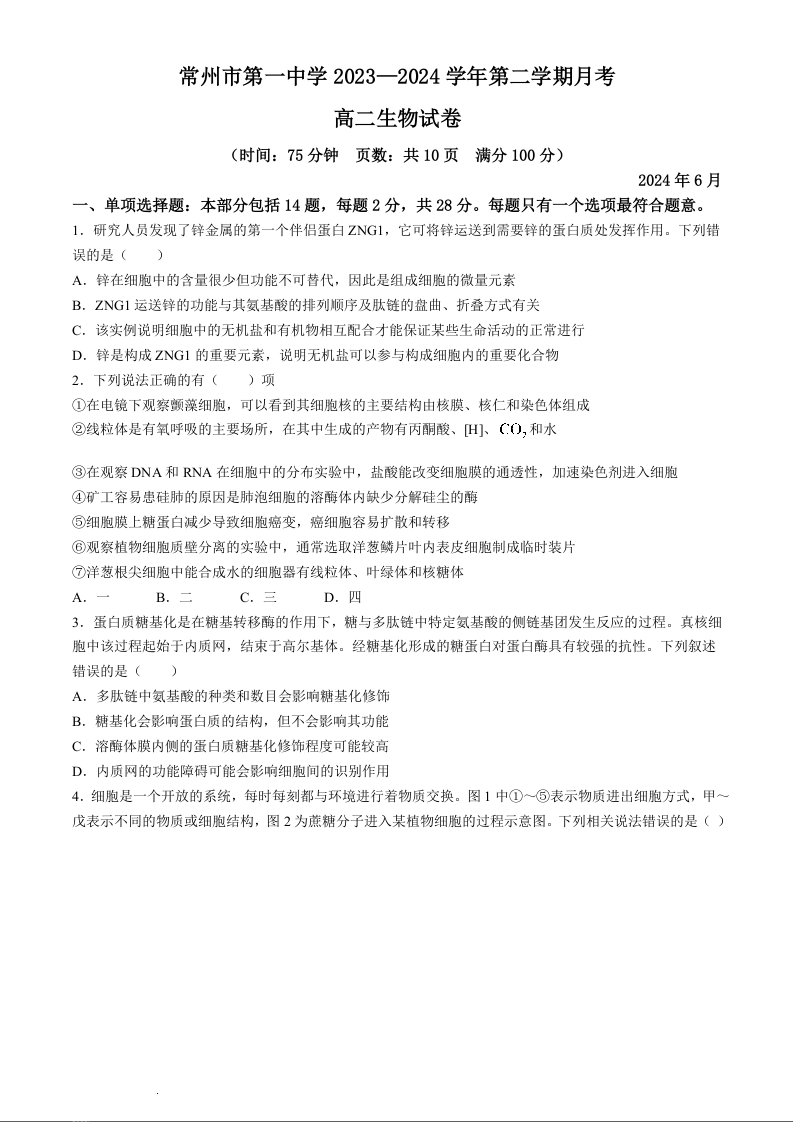 江苏省常州市第一中学2023-2024学年高二下学期6月月考生物