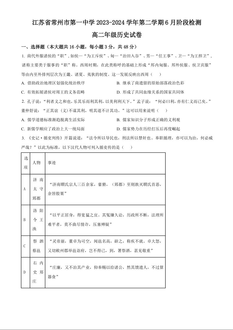 江苏省常州市第一中学2023-2024学年高二下学期6月月考历史+答案