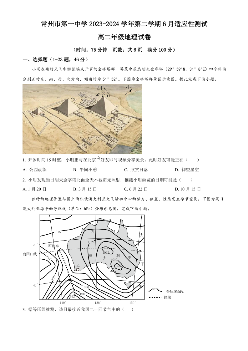 江苏省常州市第一中学2023-2024学年高二下学期6月月考地理+答案