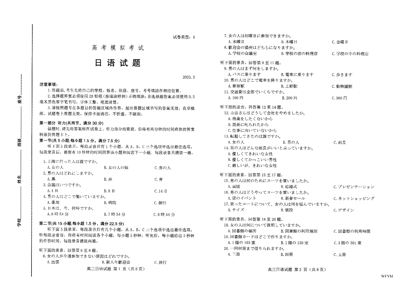 山东省潍坊市2024-2025学年下学期3月高三一模统考日语