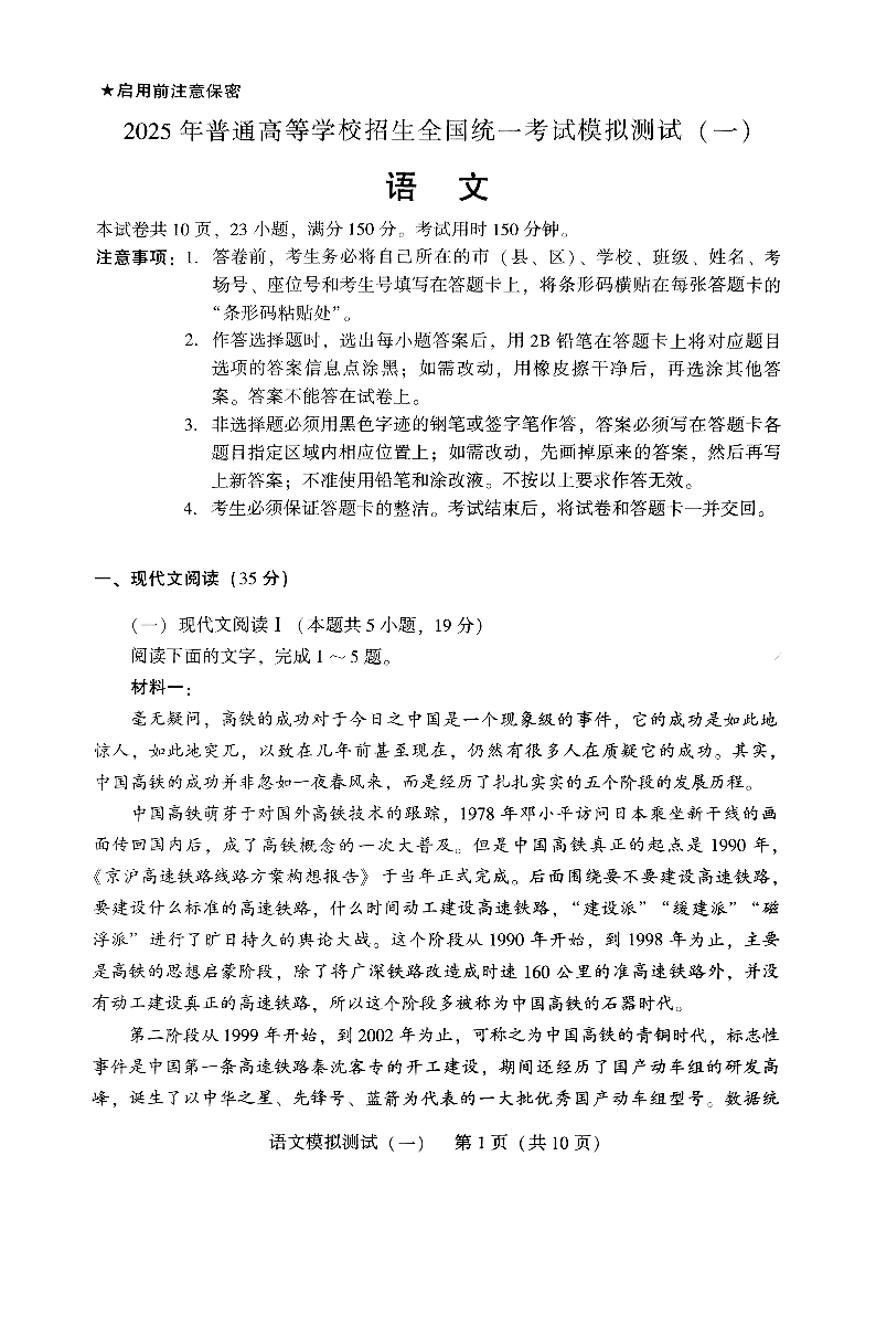 广东省2024-2025学年下学期高三高考模拟测试(一模)语文