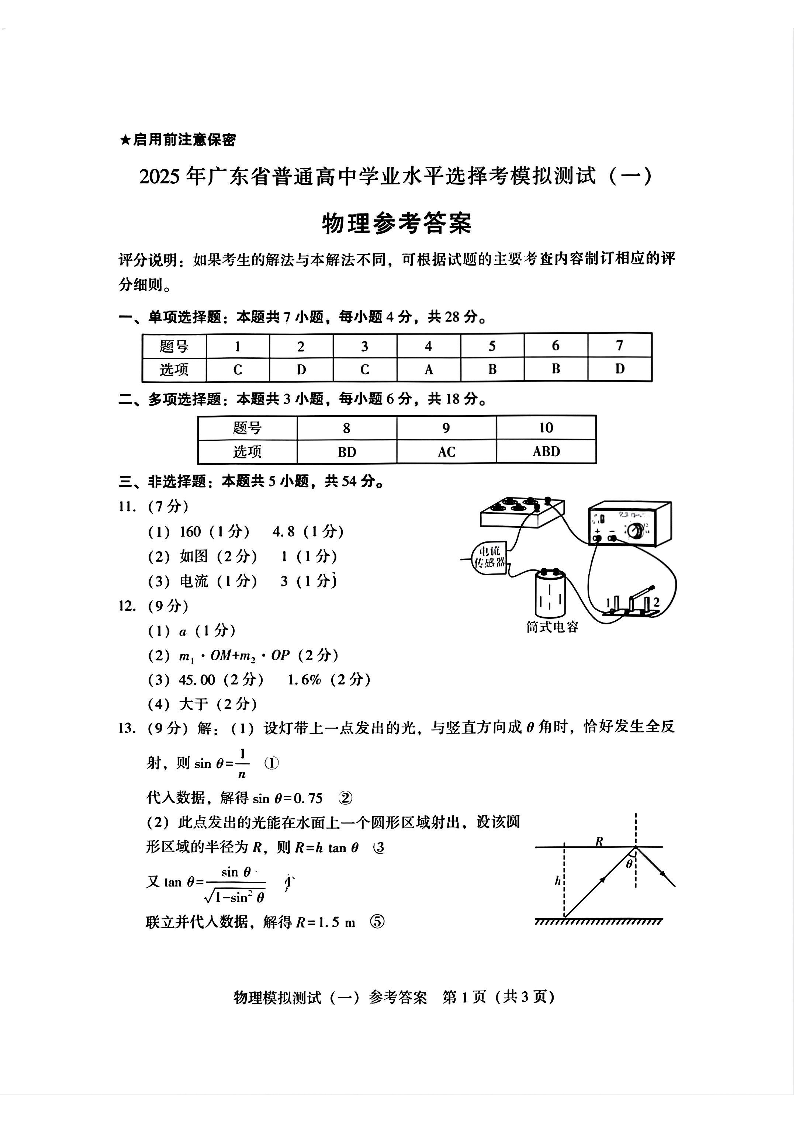 广东省2024-2025学年下学期高三高考模拟测试(一模)物理答案