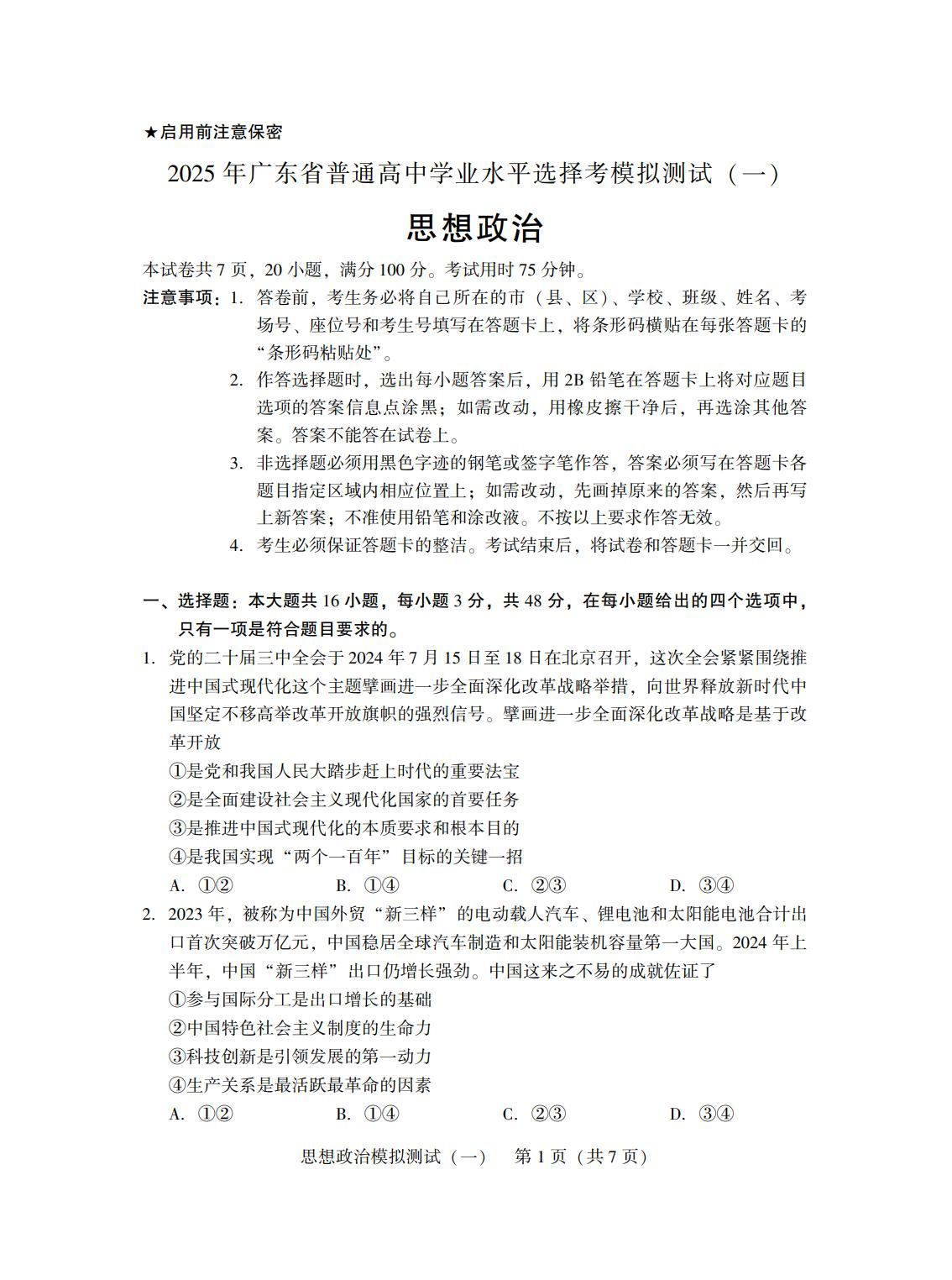 广东省2024-2025学年下学期高三高考模拟测试(一模)政治