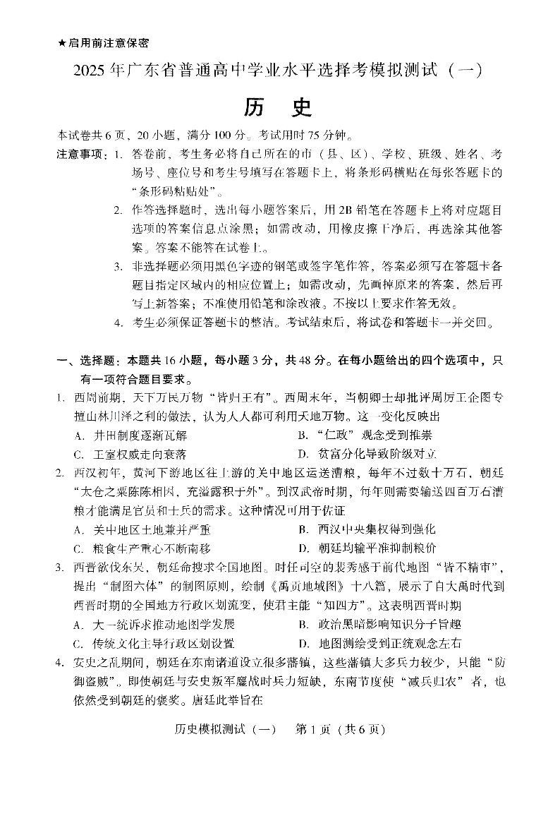 广东省2024-2025学年下学期高三高考模拟测试(一模)历史