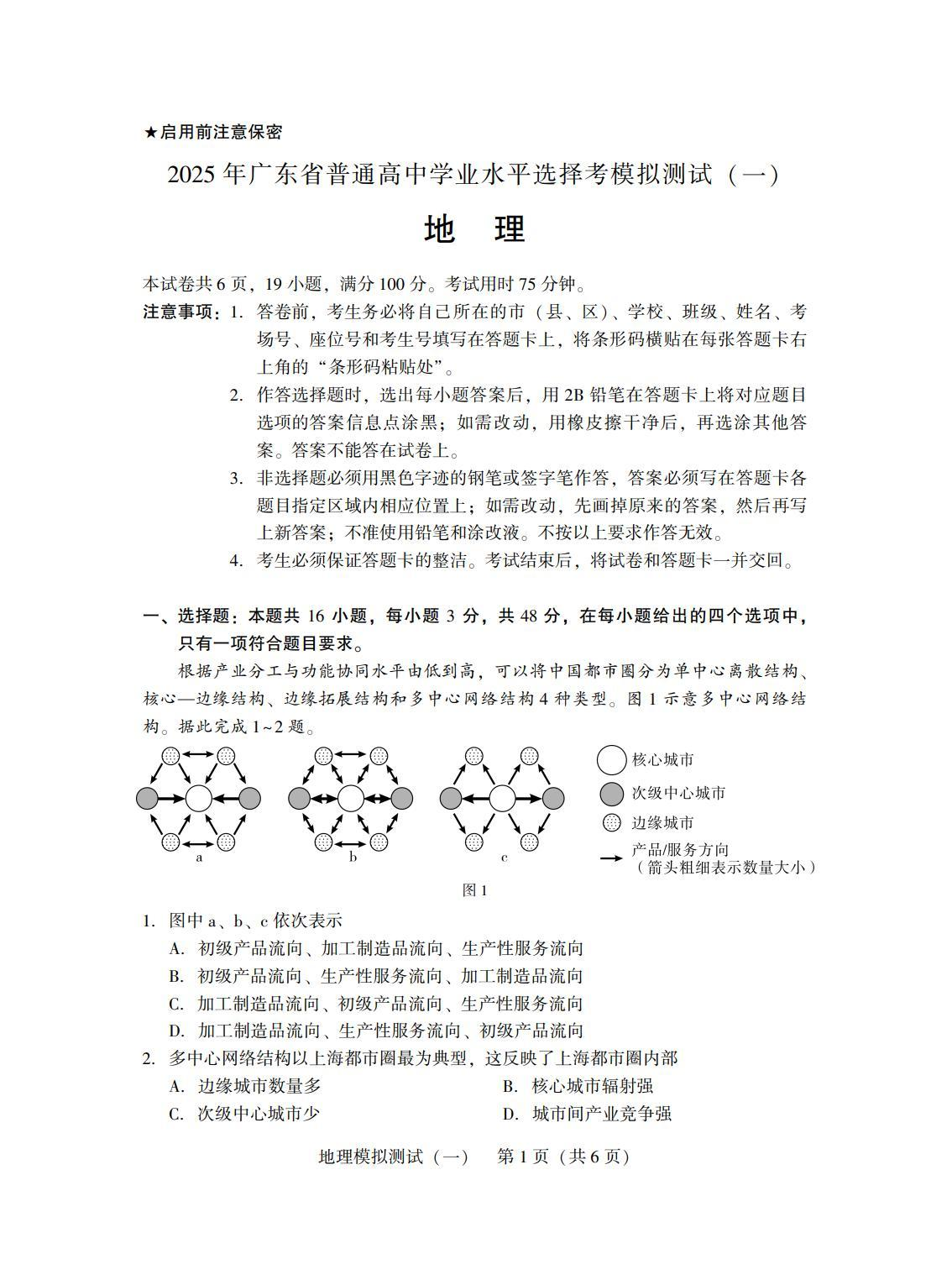 广东省2024-2025学年下学期高三高考模拟测试(一模)地理