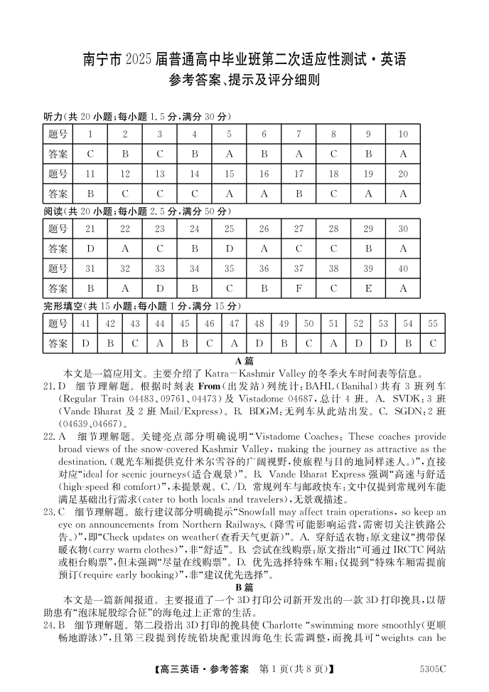 广西省南宁市2024-2025学年下学期高三二模适应性测试英语答案