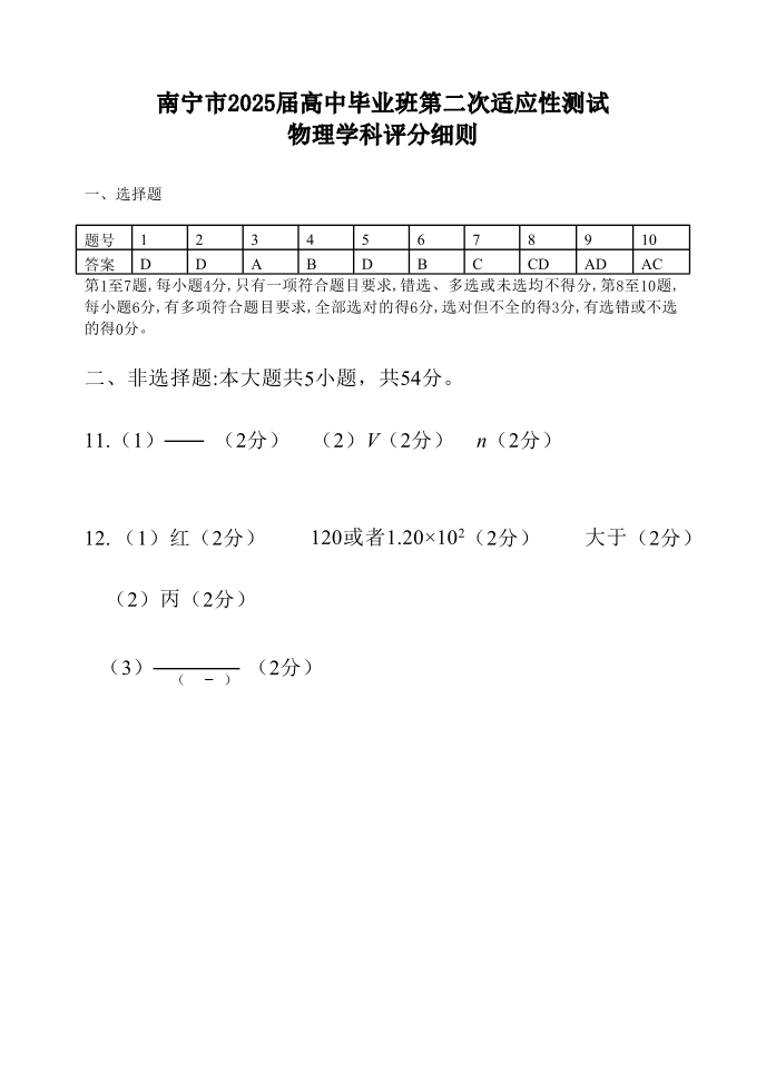 广西省南宁市2024-2025学年下学期高三二模适应性测试物理答案