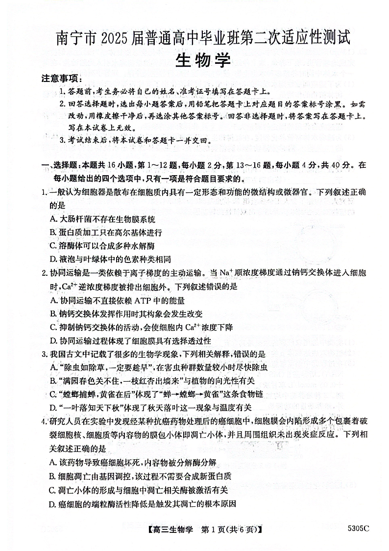 广西省南宁市2024-2025学年下学期高三二模适应性测试生物