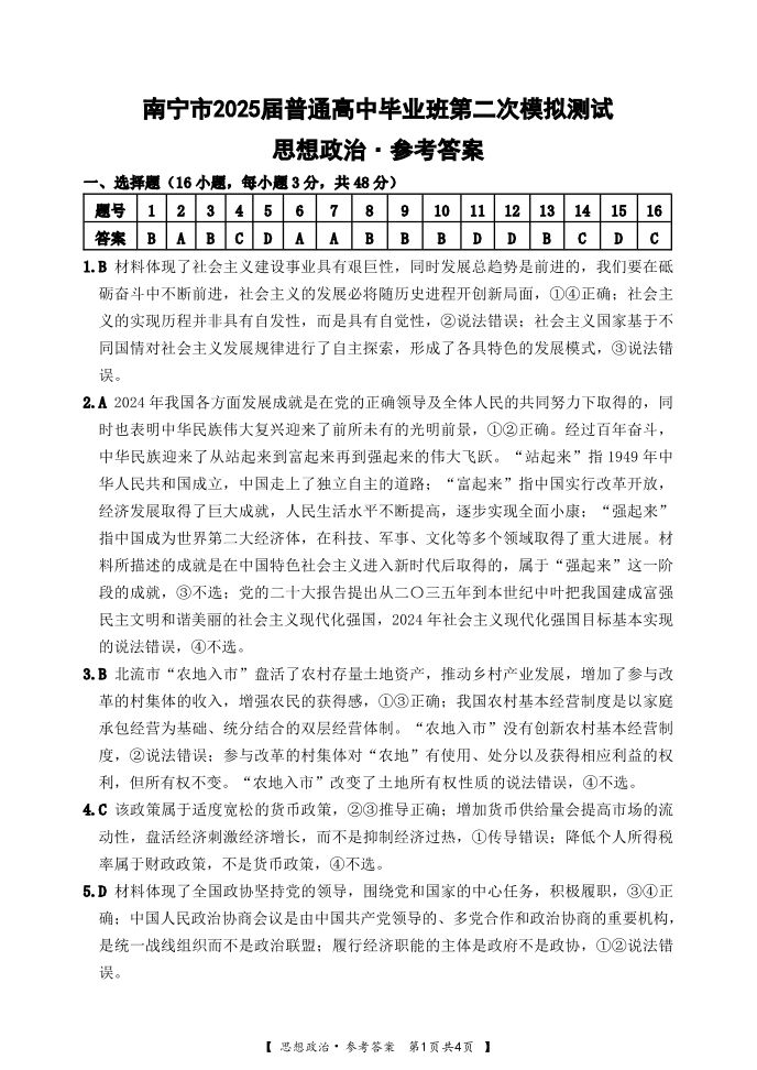 广西省南宁市2024-2025学年下学期高三二模适应性测试政治答案