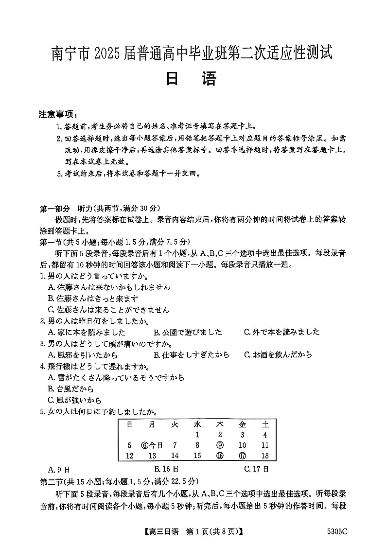 广西省南宁市2024-2025学年下学期高三二模适应性测试日语