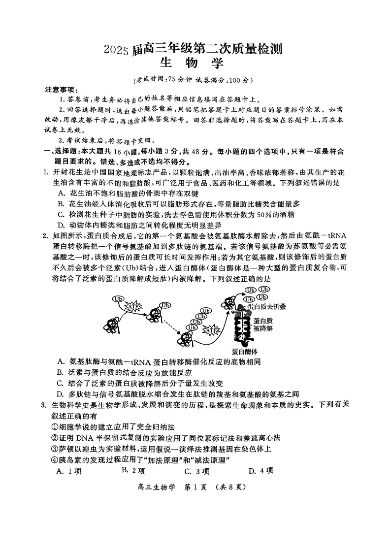河南三地市2024-2025学年下学期3月高三第二次模拟质量检测生物