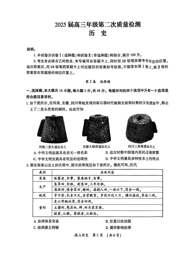 河南三地市2024-2025学年下学期3月高三第二次模拟质量检测历史