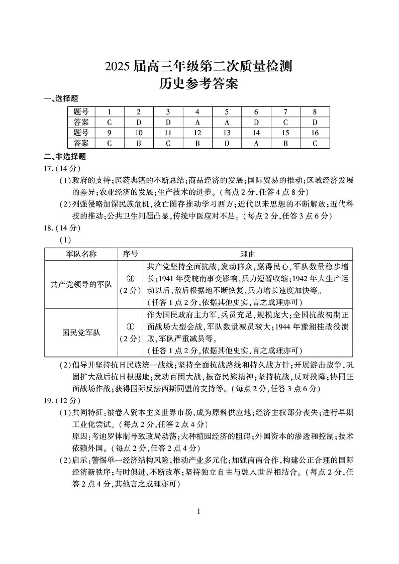 河南三地市2024-2025学年下学期3月高三第二次模拟质量检测历史答案