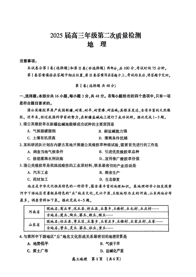 河南三地市2024-2025学年下学期3月高三第二次模拟质量检测地理+答案