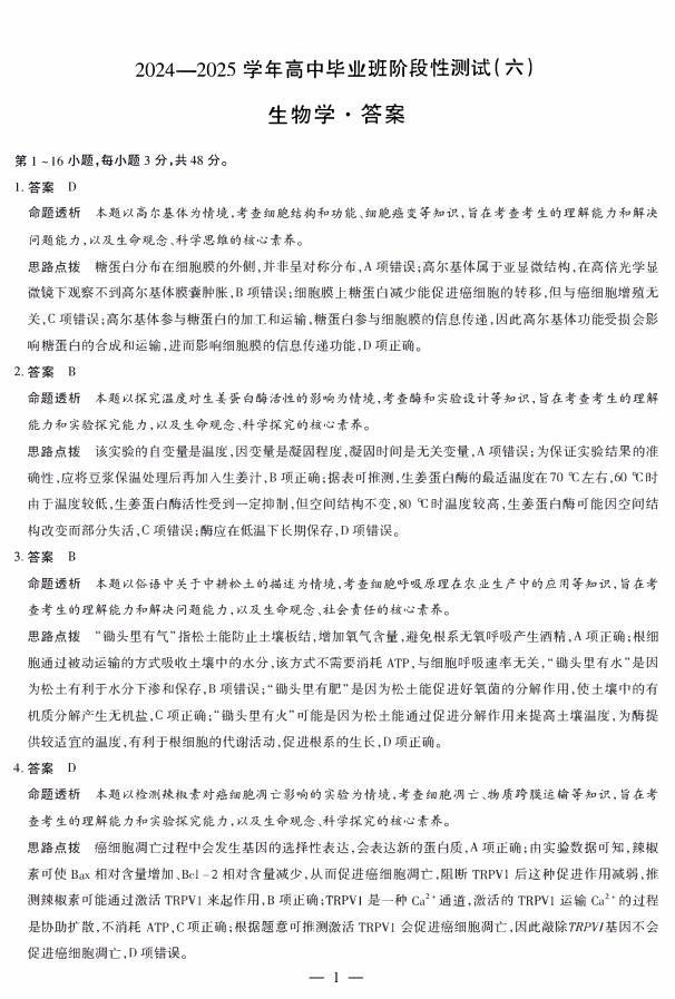 河南省区域高中2024-2025学年下学期高三阶段性测试(六)生物答案