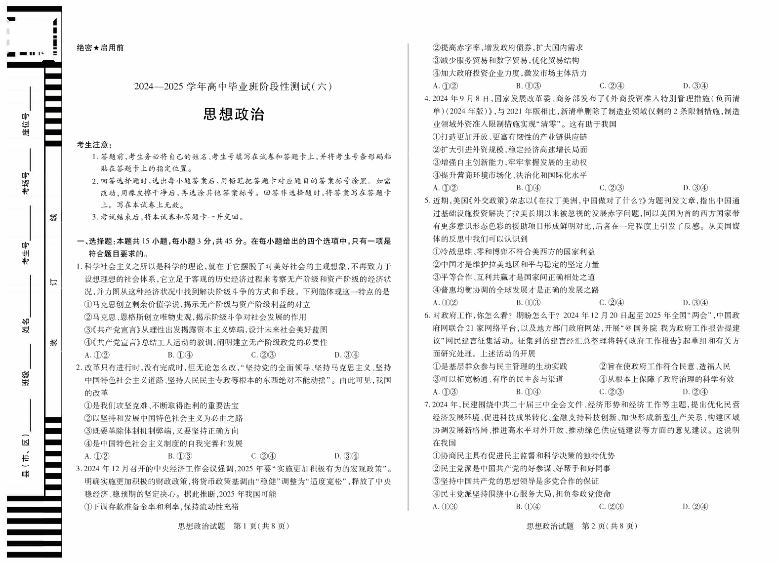 河南省区域高中2024-2025学年下学期高三阶段性测试(六)政治