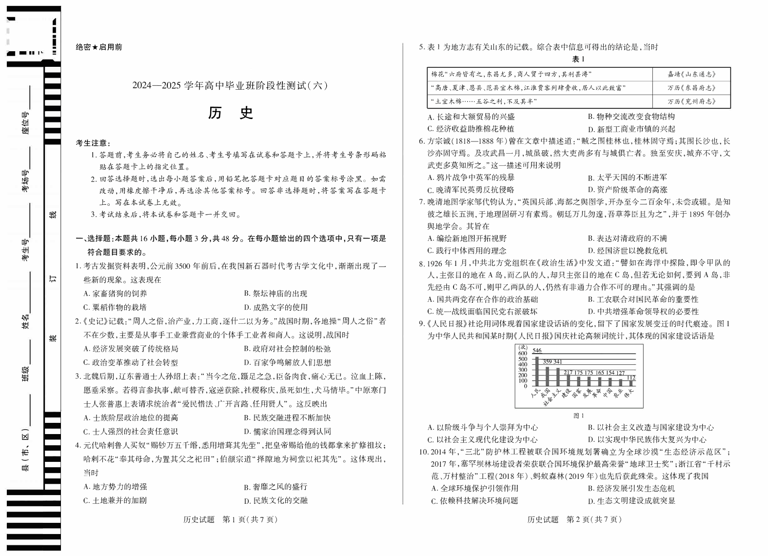 河南省区域高中2024-2025学年下学期高三阶段性测试(六)历史