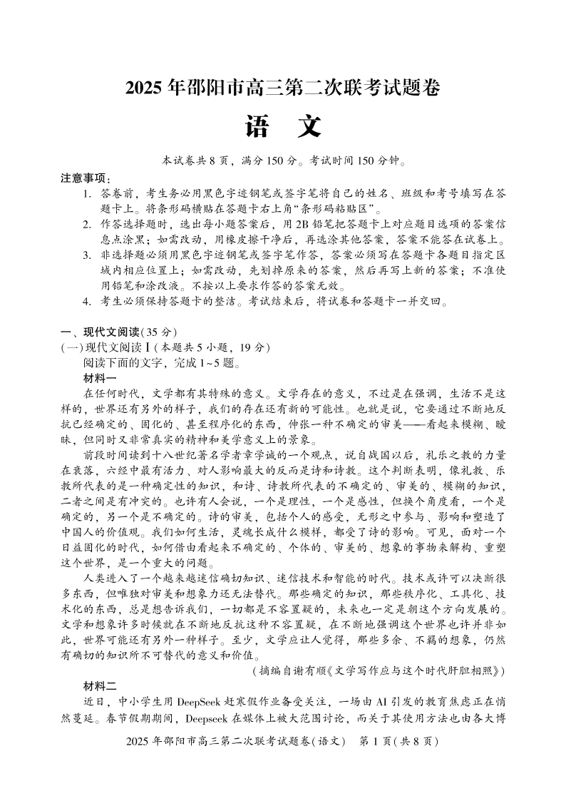 湖南省邵阳市2024-2025学年下学期高三第二次模拟考试语文