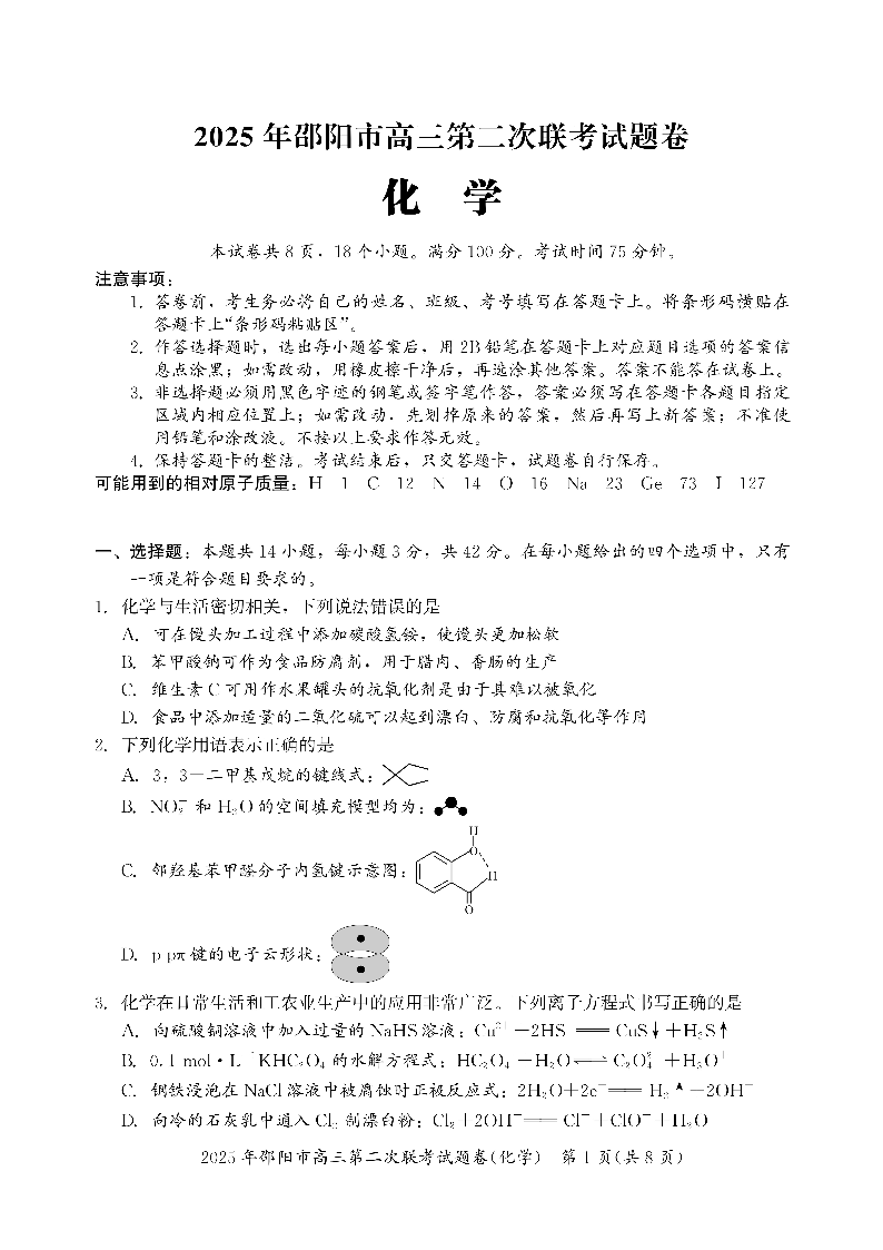 湖南省邵阳市2024-2025学年下学期高三第二次模拟考试化学
