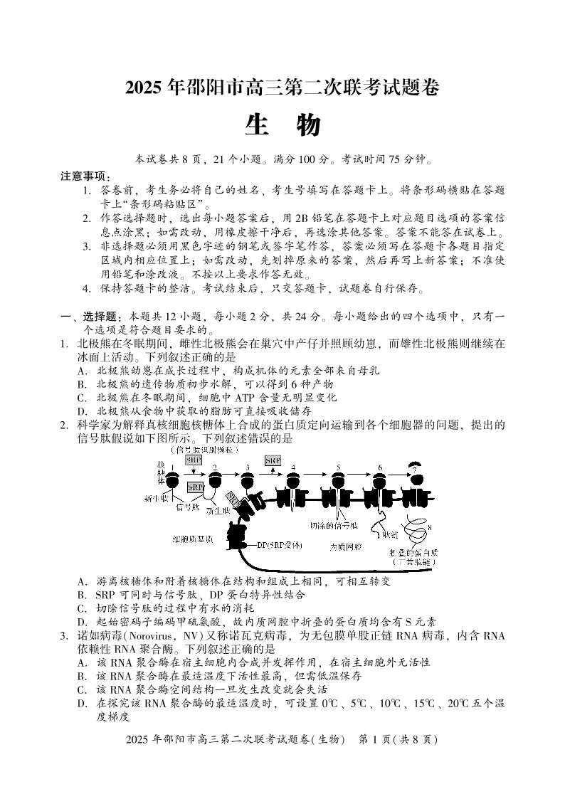 湖南省邵阳市2024-2025学年下学期高三第二次模拟考试生物
