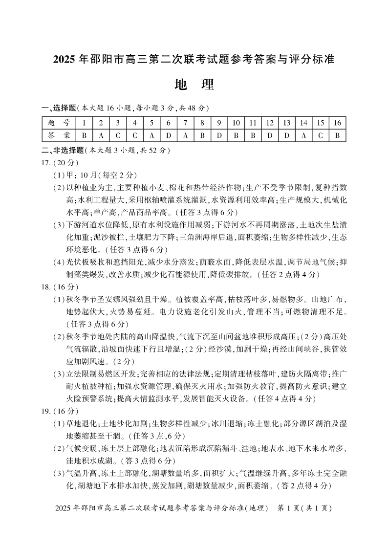 湖南省邵阳市2024-2025学年下学期高三第二次模拟考试地理答案