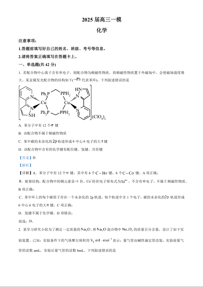 湖南省长沙市地质中学2024-2025学年下学期高三一模化学(解析版)