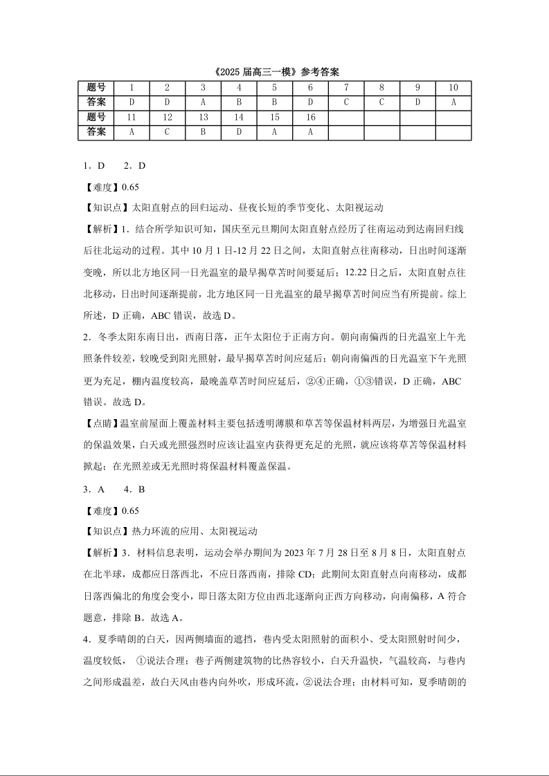 湖南省长沙市地质中学2024-2025学年下学期高三一模地理答案