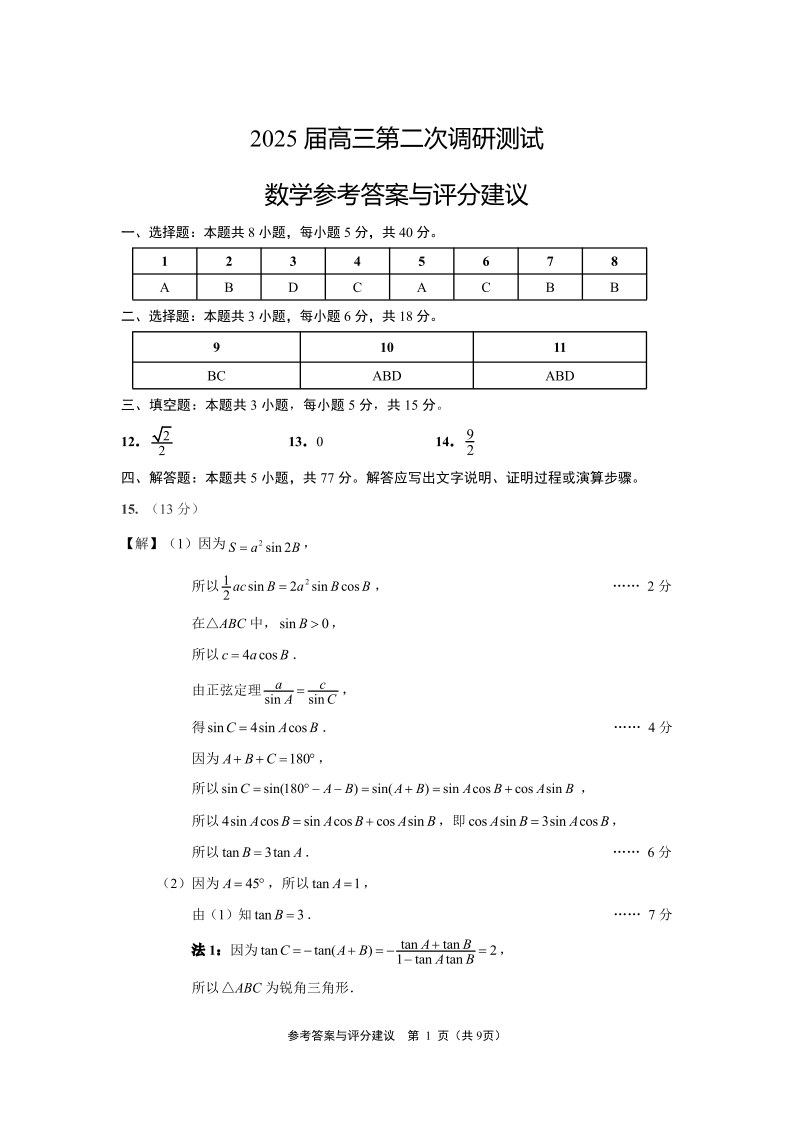 江苏省苏北七地市2024-2025学年下学期高三第二次调研数学答案