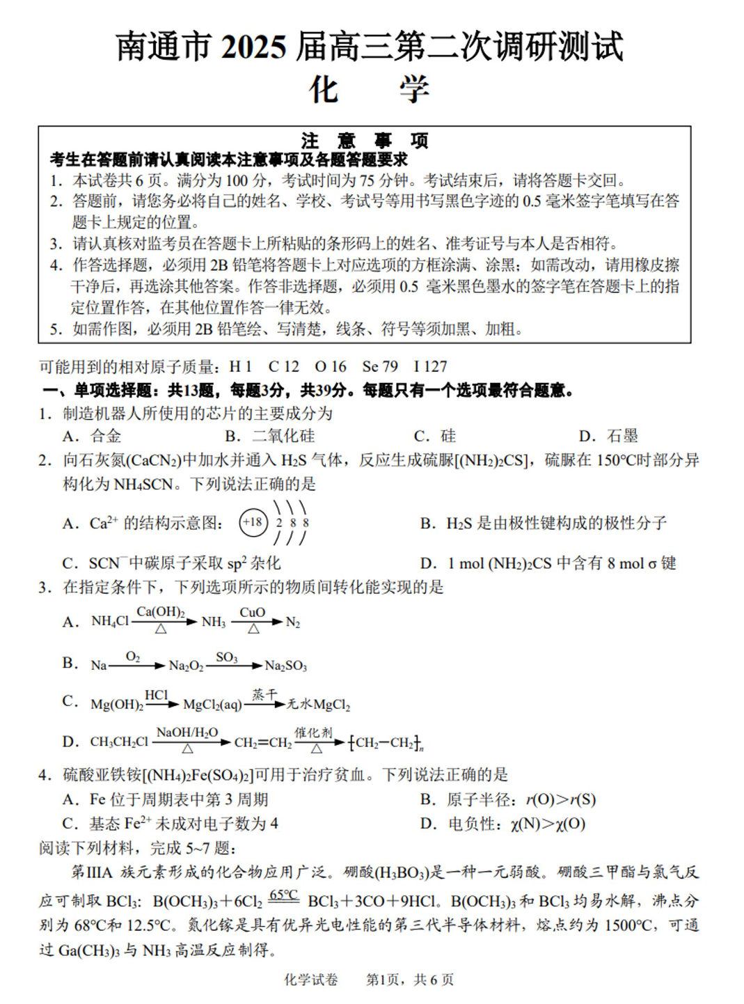 江苏省苏北七地市2024-2025学年下学期高三第二次调研化学+答案
