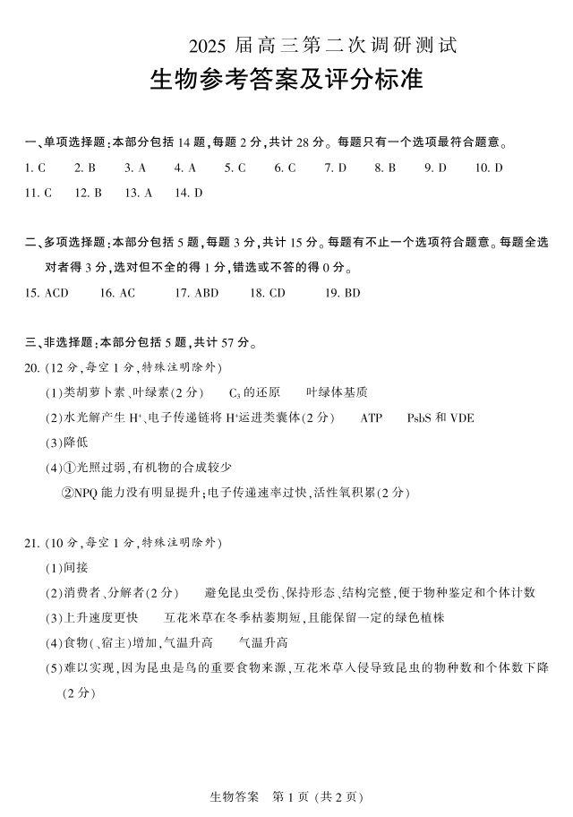 江苏省苏北七地市2024-2025学年下学期高三第二次调研生物答案