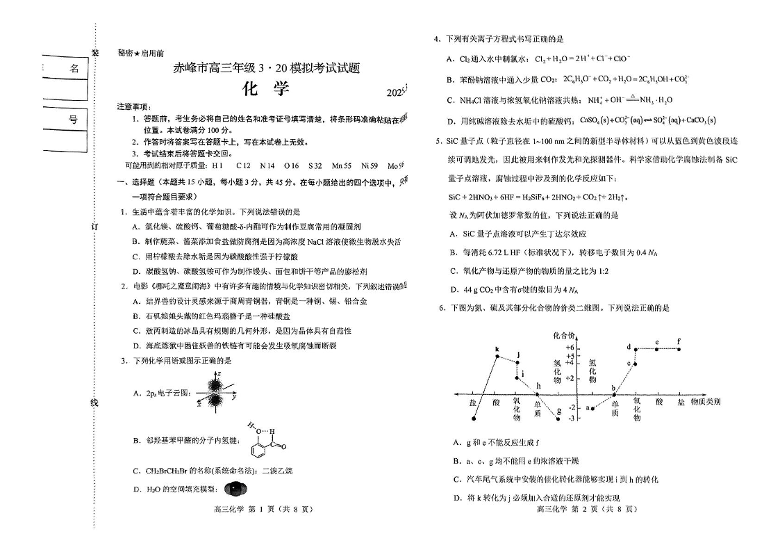 内蒙古赤峰市2024-2025学年下学期3月高三二模考试化学