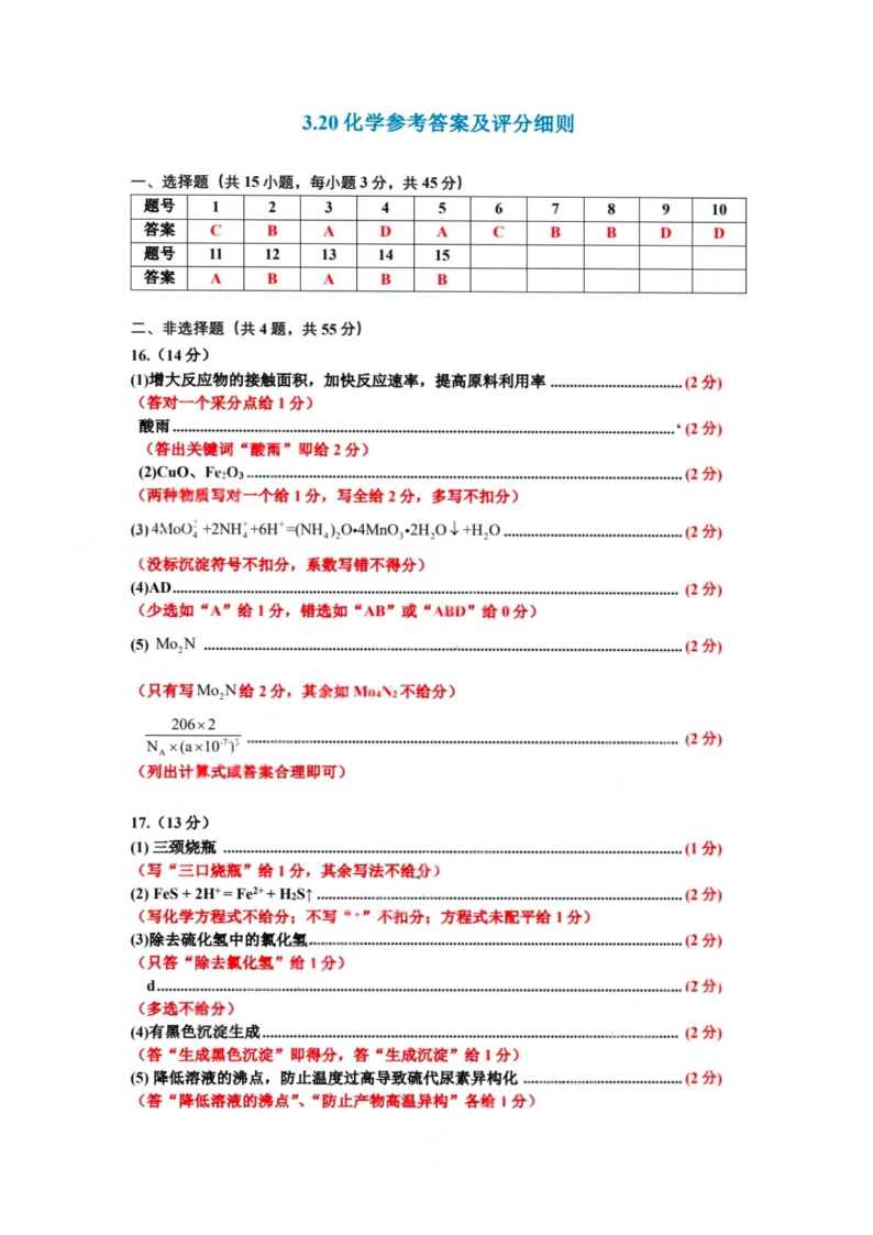 内蒙古赤峰市2024-2025学年下学期3月高三二模考试化学答案