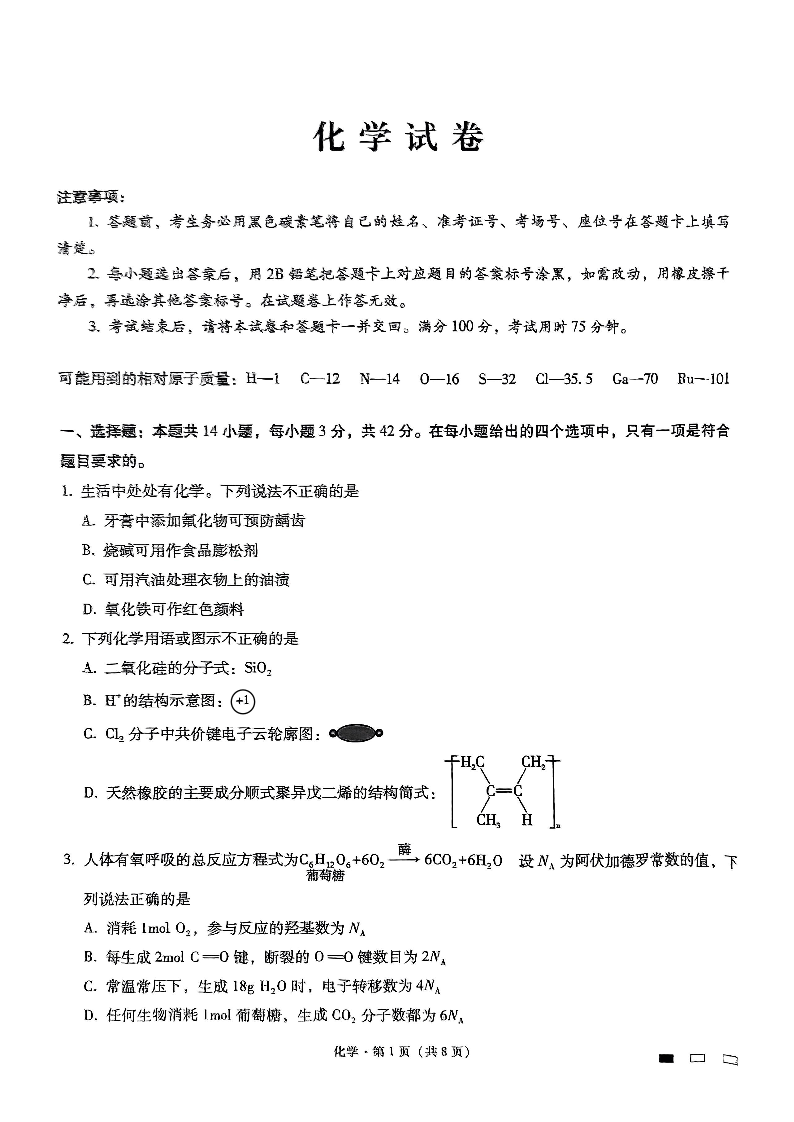 重庆市第八中学2024-2025学年下学期高三适应性月考(六)化学