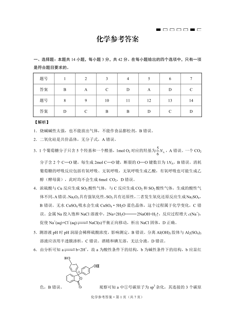 重庆市第八中学2024-2025学年下学期高三适应性月考(六)化学答案