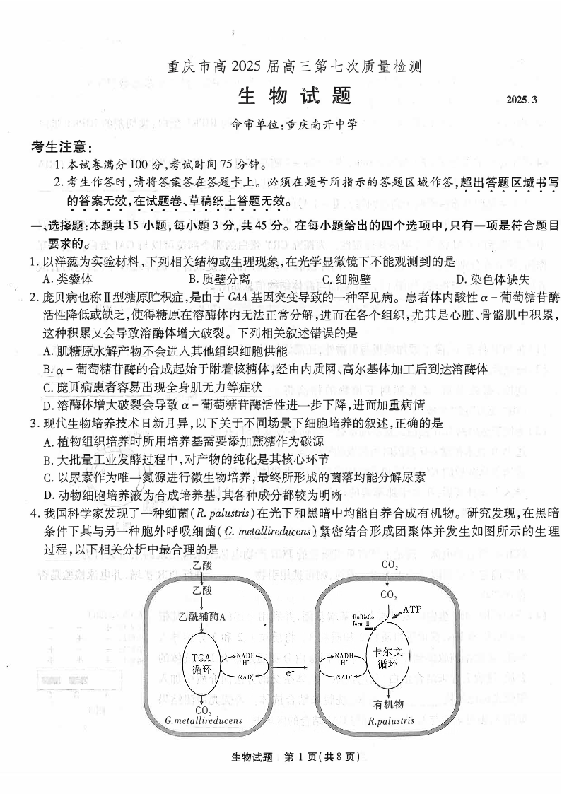 重庆市南开中学2024-2025学年下学期高三第七次质量检测生物
