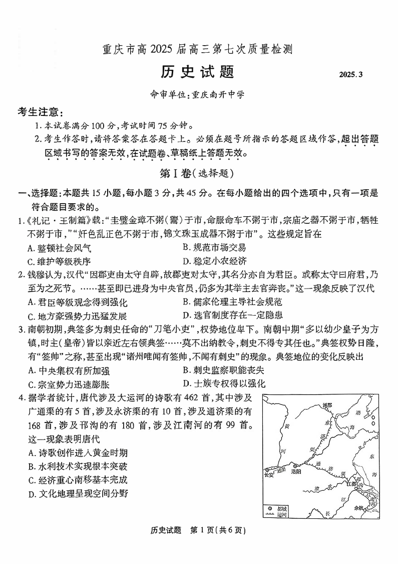 重庆市南开中学2024-2025学年下学期高三第七次质量检测历史