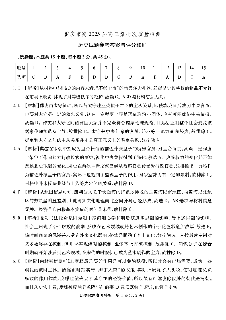 重庆市南开中学2024-2025学年下学期高三第七次质量检测历史答案