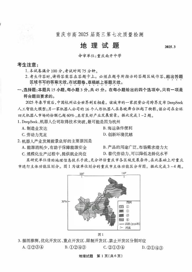 重庆市南开中学2024-2025学年下学期高三第七次质量检测地理