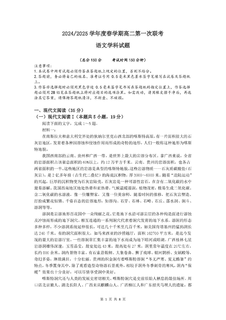 江苏省盐城市五校2024-2025学年下学期3月高二第一次联考语文